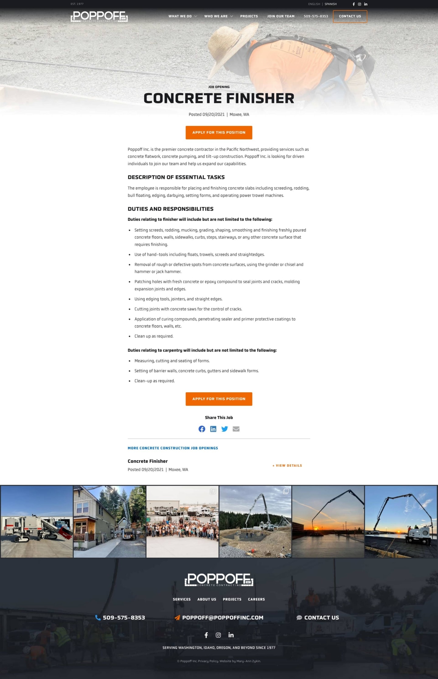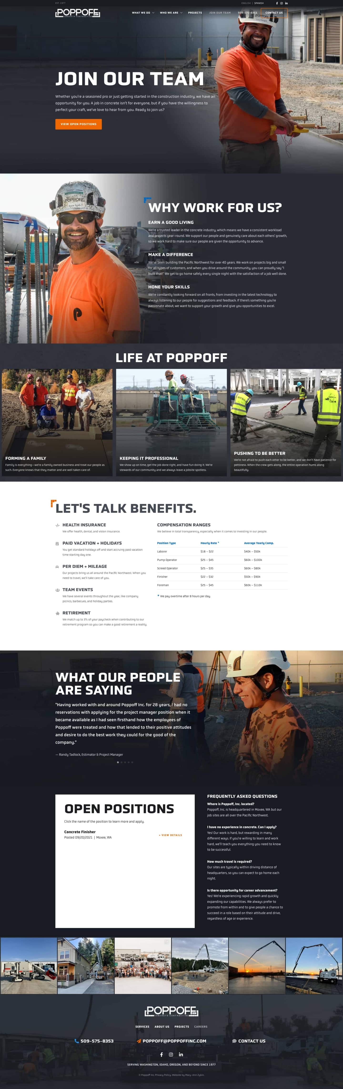 The website was designed as a testament to Poppoff's tight-knit culture—everyone that I talked to at the on-site told me about how the company truly takes care of them, genuinely invests in their professional and personal development, and is overall the best contractor they've ever worked for.
